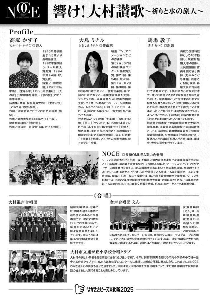 第2部は、大村在住の詩人・髙塚かず子が書き下ろした「大村讃歌~声と音楽のために~」の詩に、大島ミチルが作曲。朗読・合唱・演奏のコラボレーション!